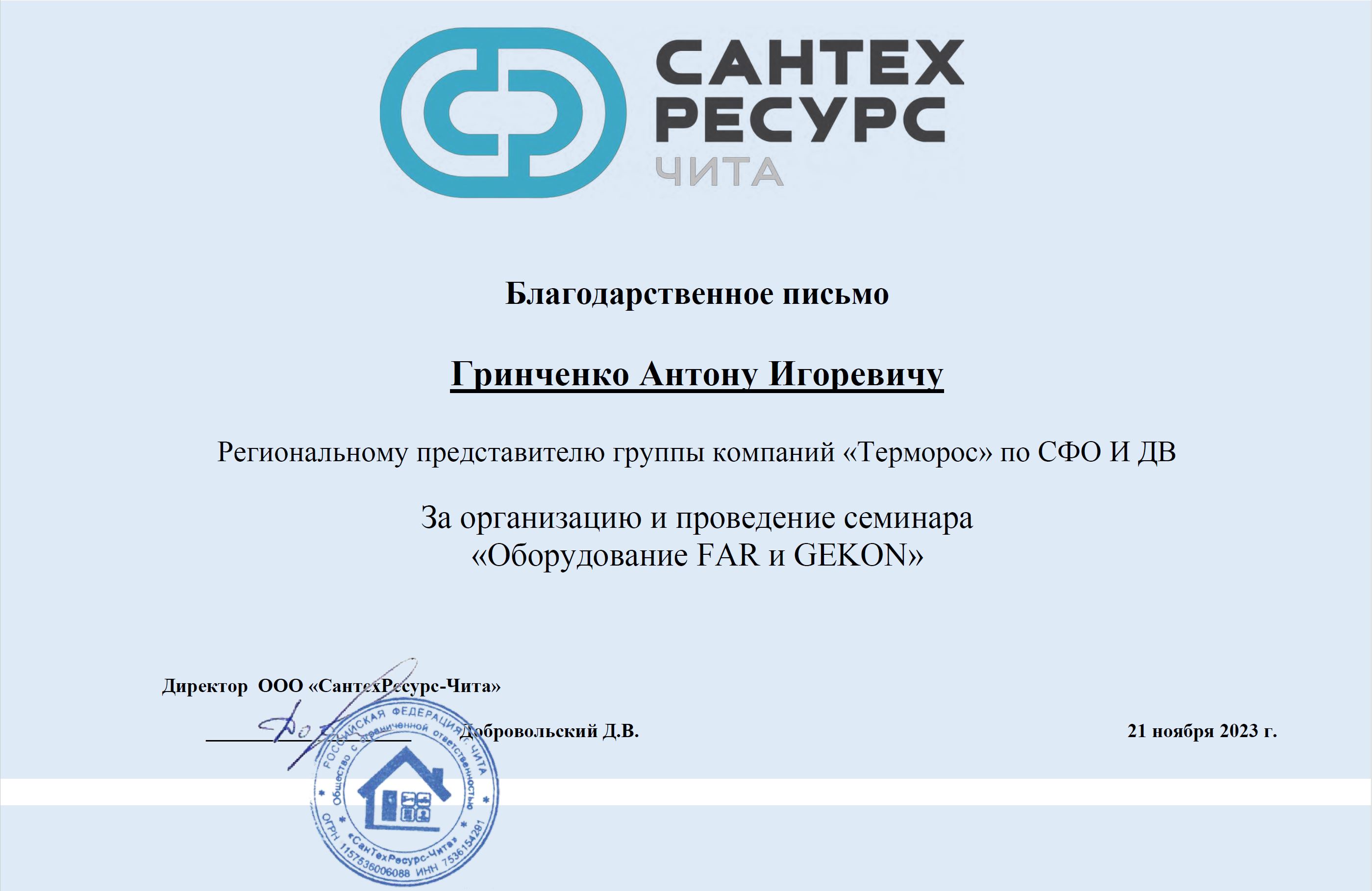 За организацию и проведение актуального, интересного и полезного семинара Антон Гринченко получил благодарственное письмо от компании «СантехРесурс-Чита».