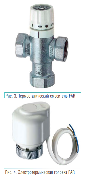Термостатический смеситель TermoFar – оригинальная разработка конструкторов FAR, выгодно выделяющая системы водяного отопления этой фирмы от большинства предложений рынка (рис. 3). На корпус термосмесителя нанесены стрелки подвода горячей (hot), холодной (cold) и выхода смешанной (mix) воды. Внутри корпуса находится термостатический датчик, интегрированный с заслонкой холод ной и горячей воды. В зависимости от фиксируемой температуры, он регулирует соотношение горячей и холодной воды, поддерживая температуру воды на выходе из смесителя на установленном уровне (в диапазоне 20–55 °С).