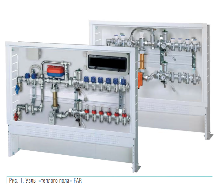 Центр системы «теплый пол» (рис. 1) состоит из запорного и терморегулирующего коллекторов диаметром 25, 32 и даже 40 мм, позволяющих сбалансировать работу всей системы и отрегулировать температуру в каждом отдельном помещении. В 2009 г. завод FAR увеличил ассортимент коллекторов для напольного отопления, включив в свою производственную линейку коллекторы со встроенными расходомерами.