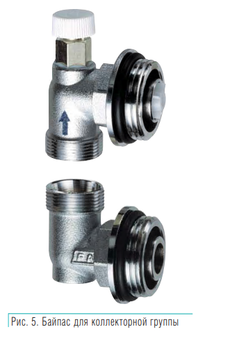 Дополнительное оборудование Автоматическое управление тепловым режимом отдельных веток осуществляется электротермическими головками (рис. 4) по сигналу от комнатного термостата. При полном или частичном закрытии терморегулирующих вентилей может возникнуть шум и произойти рост сопротивления в отопительных контурах. Для устранения этого недостатка подающий и обратный коллекторы соединяются байпасом со встроенным перепускным дифференциальным клапаном. К обратному коллектору байпас присоединяется через дифференциальный клапан, интегрированный с ручным воздухоотводчиком (рис. 5). Клапан открывается при дифференциальном давлении, примерно равном 0,2 бара, и излишний поток отводится назад в котел. Дополнительное преимущество, реализованное в системе FAR, – наличие высокотемпературного контура в узле напольного отопления, позволяющего подключить радиаторы или полотенцесушители.