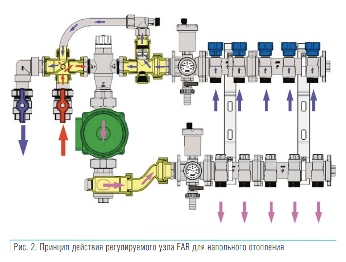 Основной частью коллекторов является распределительный узел с термосмесителем или смесительным краном с трехточечным сервоприводом. Циркуляция осуществляется следующим образом (рис. 2): подаваемый из котла теплоноситель поступает через шаровой кран и распределительную крестовину в смеситель.